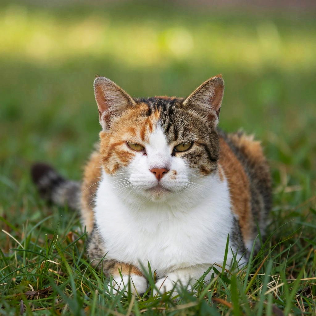 A photograph of a calico cat with dark, orange, and white fur, lounging in a lush, green grass field. The cat's yellow eyes are half-closed, and it has a relaxed, slightly grumpy expression. The background is a soft-focus blend of greenery, creating a peaceful, sunlit atmosphere. The cat's fur has a shiny texture, contrasting with the blurred grass.