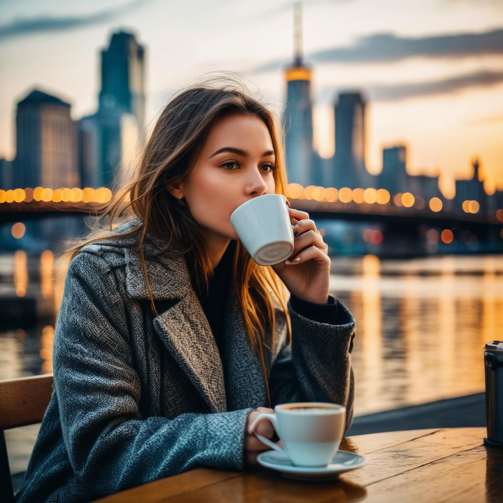 A young woman sipping coffee at a cafe in the afternoon with a city skyline in the background, soft warm bokeh lights from buildings and street lamps reflecting on water, cinematic and moody atmosphere, detailed facial expression, casual coat, urban night scene