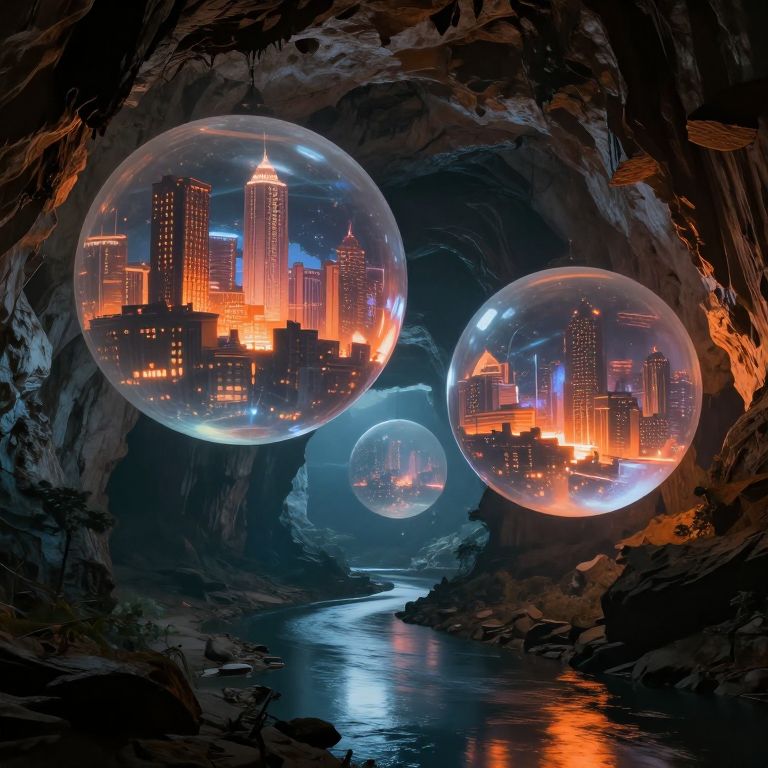 Giant translucent spheres drift serenely through an expansive underground cavern, each encapsulating a vibrant virtual cityscape illuminated by warm orange lights, while a tranquil river flows below, reflecting the ethereal glow.