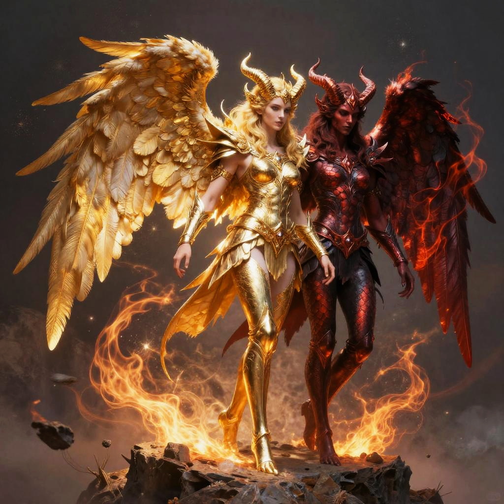A striking half angel half demon character standing on a rocky cliff, one side radiant with golden feathers and celestial armor, the other side shadowed with red scales and fiery horns, surrounded by swirling ethereal flames and celestial light.