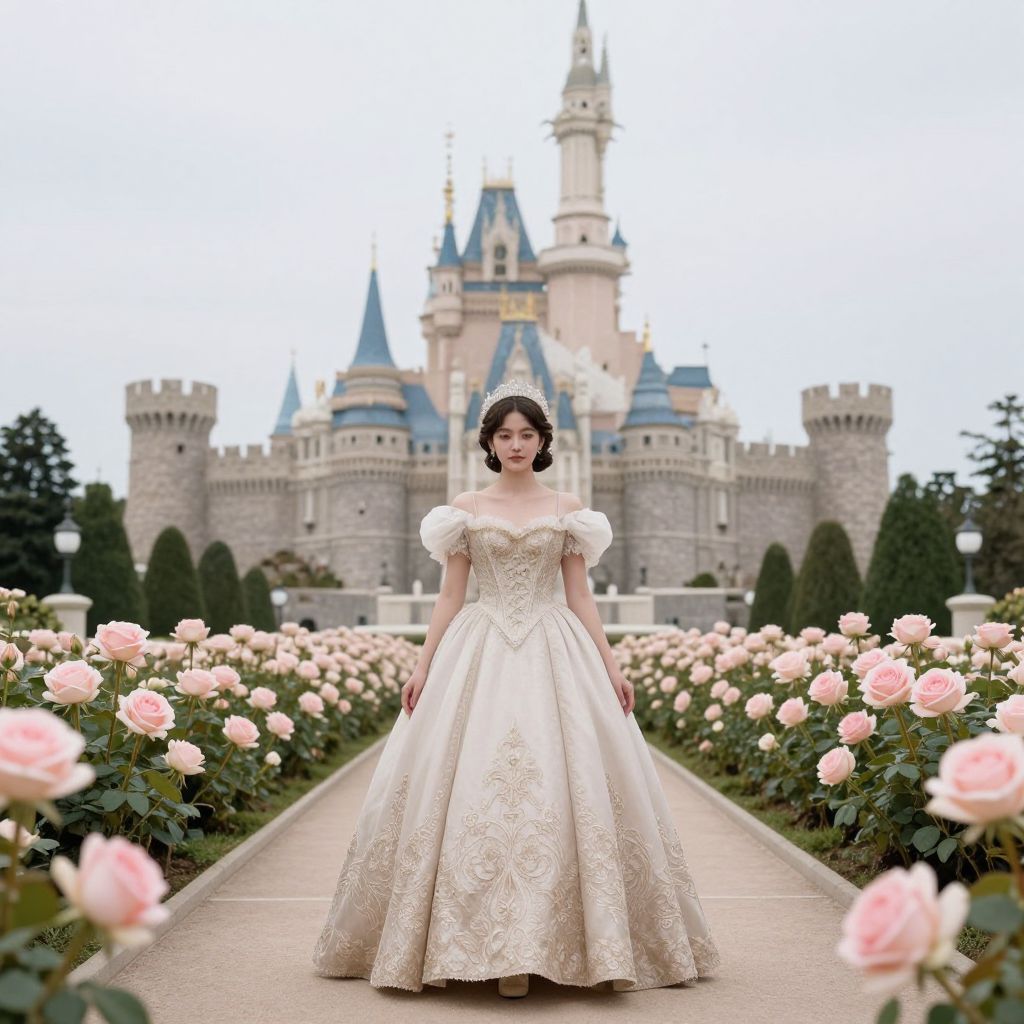 Woman in a vibrant Mary Poppins costume gracefully dancing under a full moon, surrounded by an enchanted crowd in a Disney-themed setting with illuminated castle towers in the background.