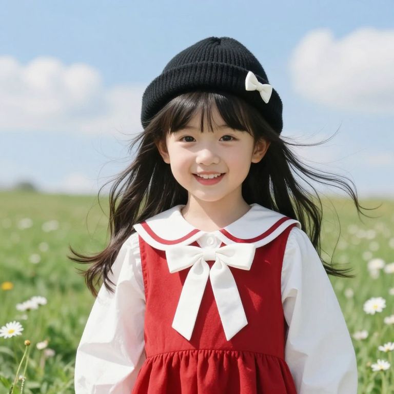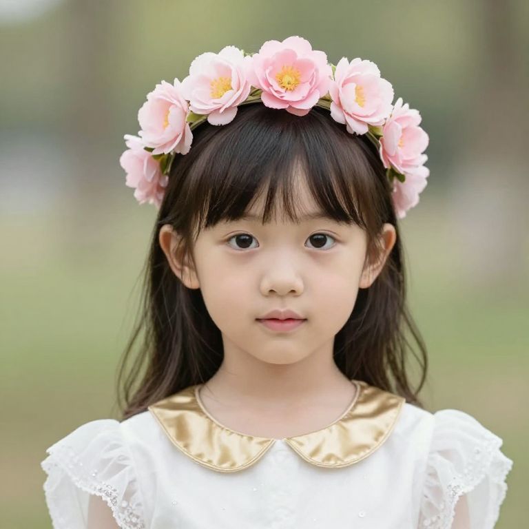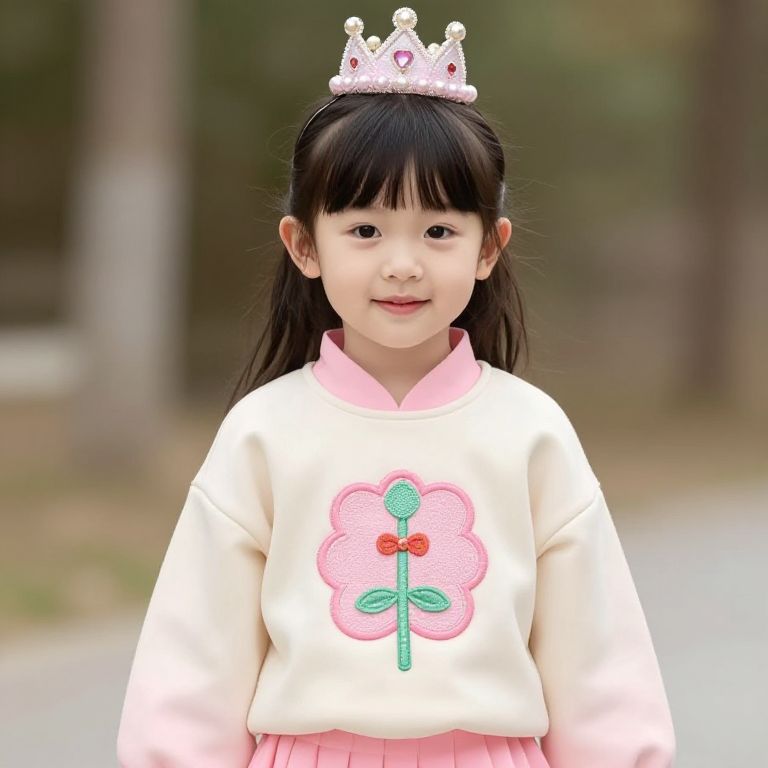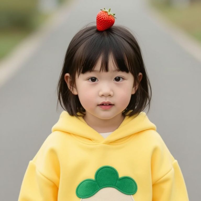 A young girl with a strawberry on her head is wearing a yellow hoodie with green leaves on it.