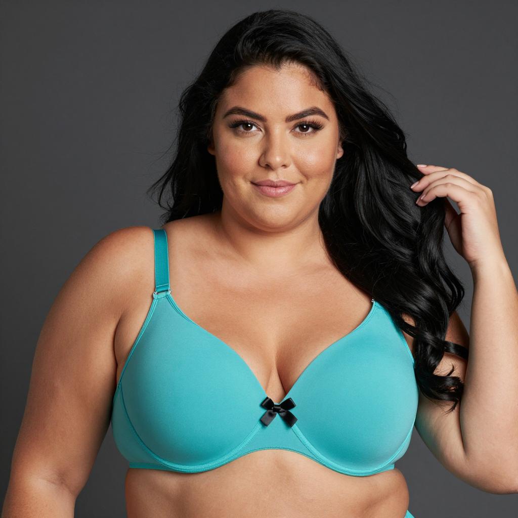 Portrait of a curvy woman with light brown skin and shoulder-length brown hair wearing a blue, buttoned, padded bra with adjustable straps. She has dark eyebrows, brown eyes, and small gold hoop earrings. The background is blurred green and brown, suggesting an outdoor setting.