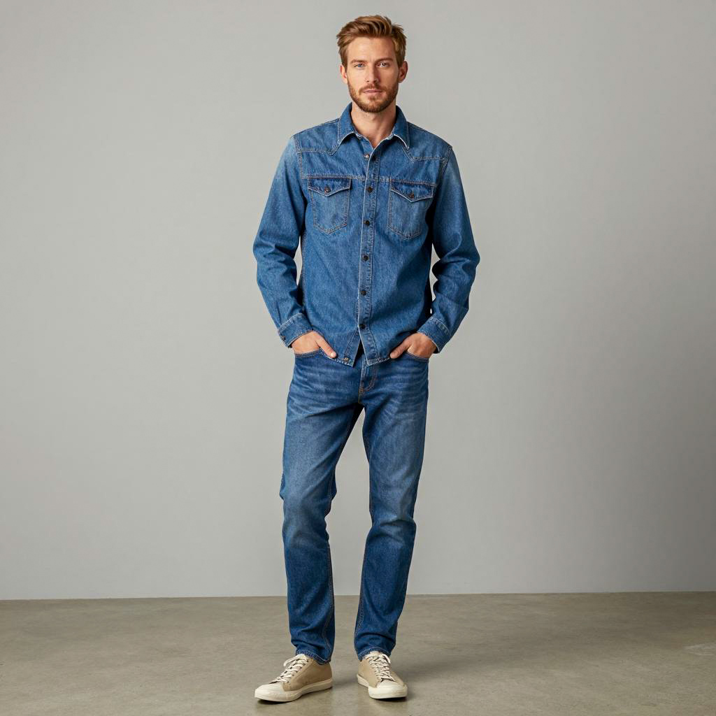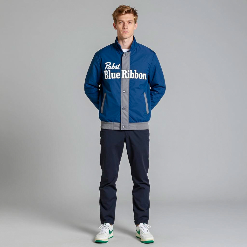 Pabst blue ribbon costume, photograph of young man standing, full body, front view, studio lighting, neutral gray background, wearing blue Pilgrim Blue Ribbons sports jacket, white lettering on jacket, gray panel on front, dark navy pants, white sneakers with green accents, hands behind back, short light brown hair, serious expression, simple shadows, daytime, casual athletic style