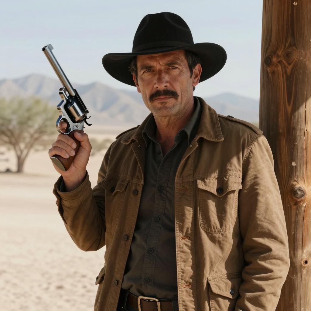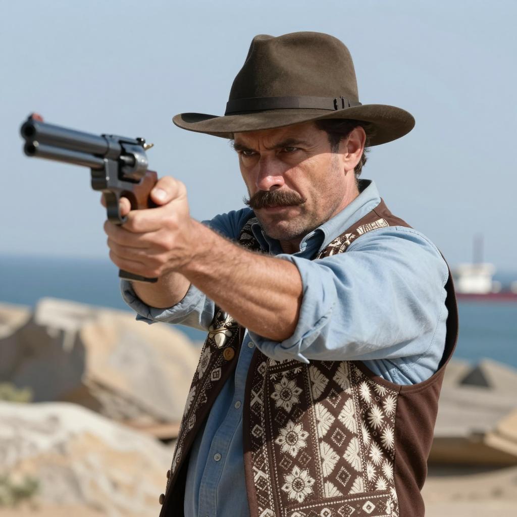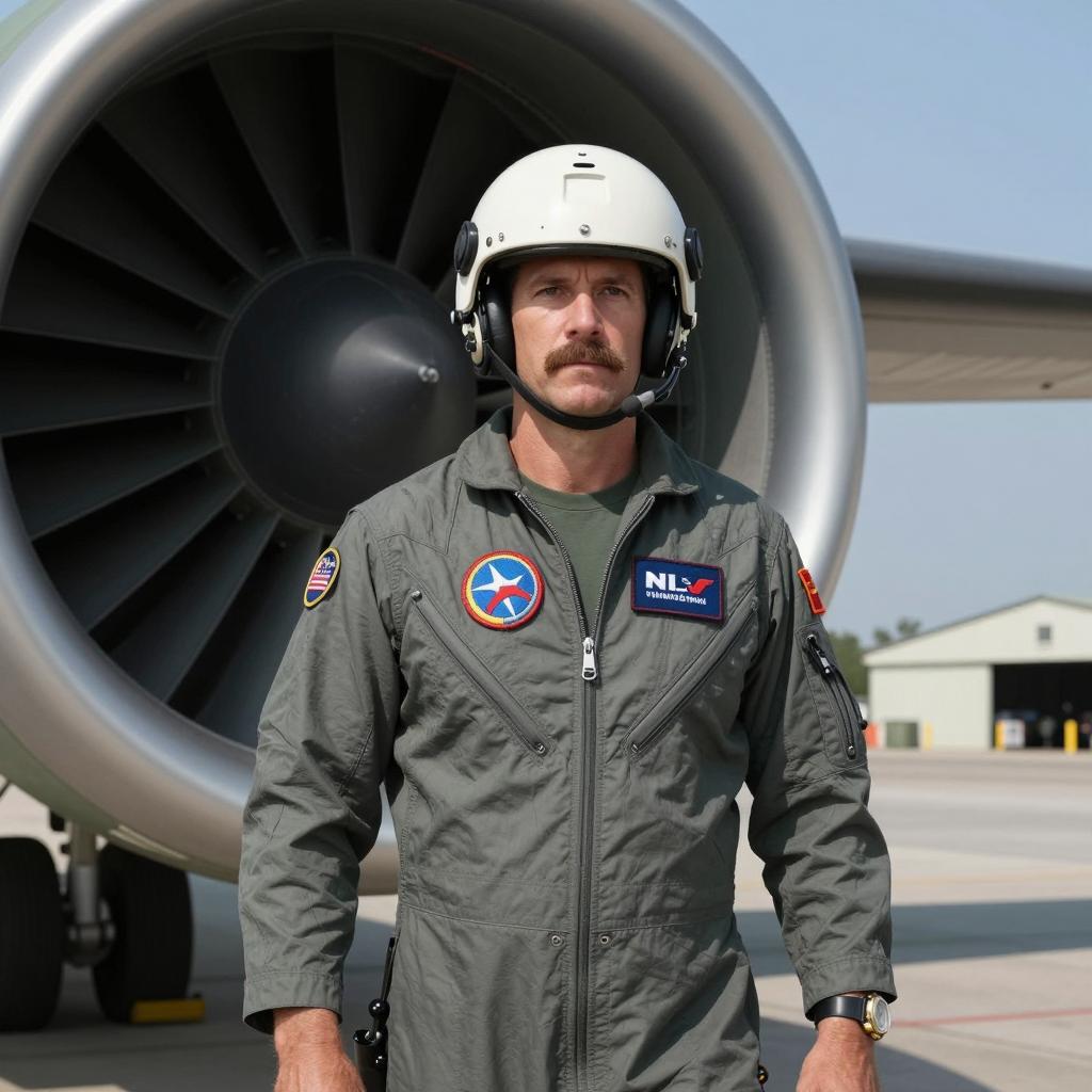 A man with dark skin, mustache, and brown leather jacket stands in front of a yellow and silver propeller airplane. He wears goggles on his head, a beige shirt, and has one arm raised. The airplane's nose and propeller are on the right. Background includes a clear blue sky and an airport with a white trailer. The man has a confident expression.