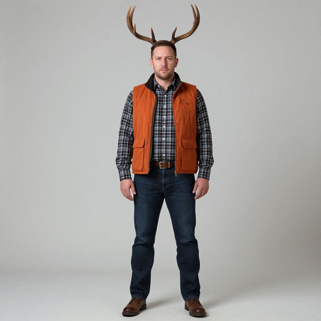 Man with antlers on his head, wearing a plaid shirt, orange vest, blue jeans, and brown shoes.