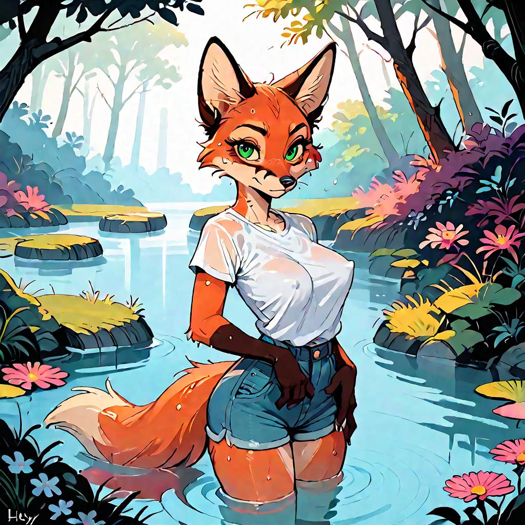 Score 9, score 8 up, score 7 up, score 6 up, score 5 up, score 4 up, source furry, female, anthro fox, green eyes, standing, white t-shirt, shorts, outdoors, river, wet, partially submerged, sexually suggestive, looking at viewer, dim lighting, sunbeam, nipple outline