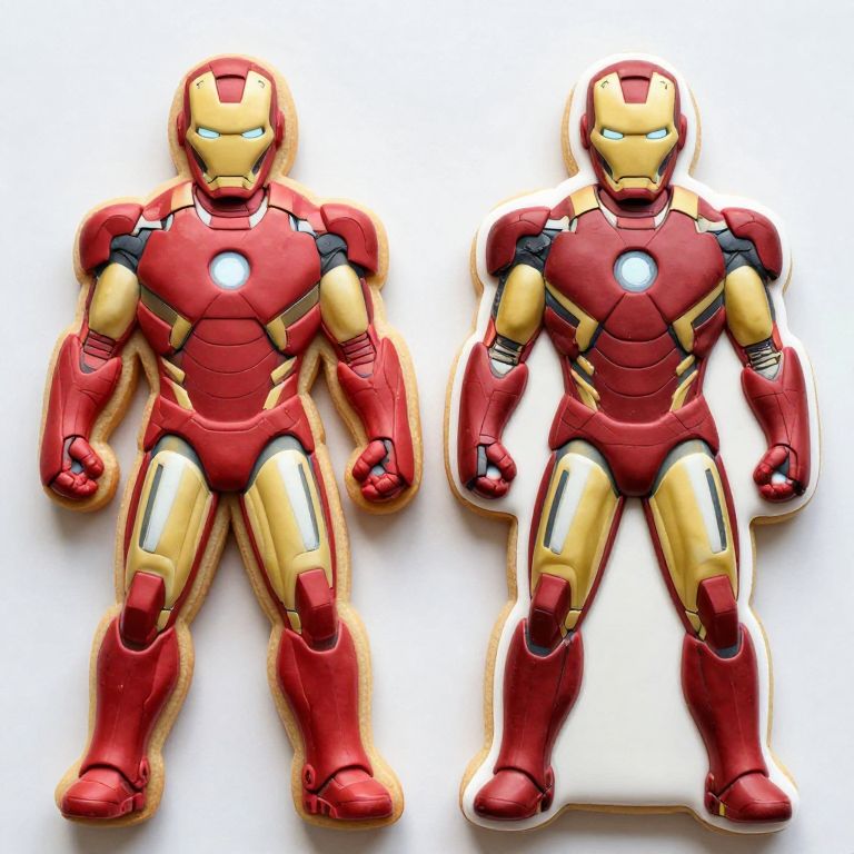 Iron Man-themed cookie cutter and its corresponding decorated sugar cookie displayed side by side, showcasing intricate details of the iconic superhero's suit design.