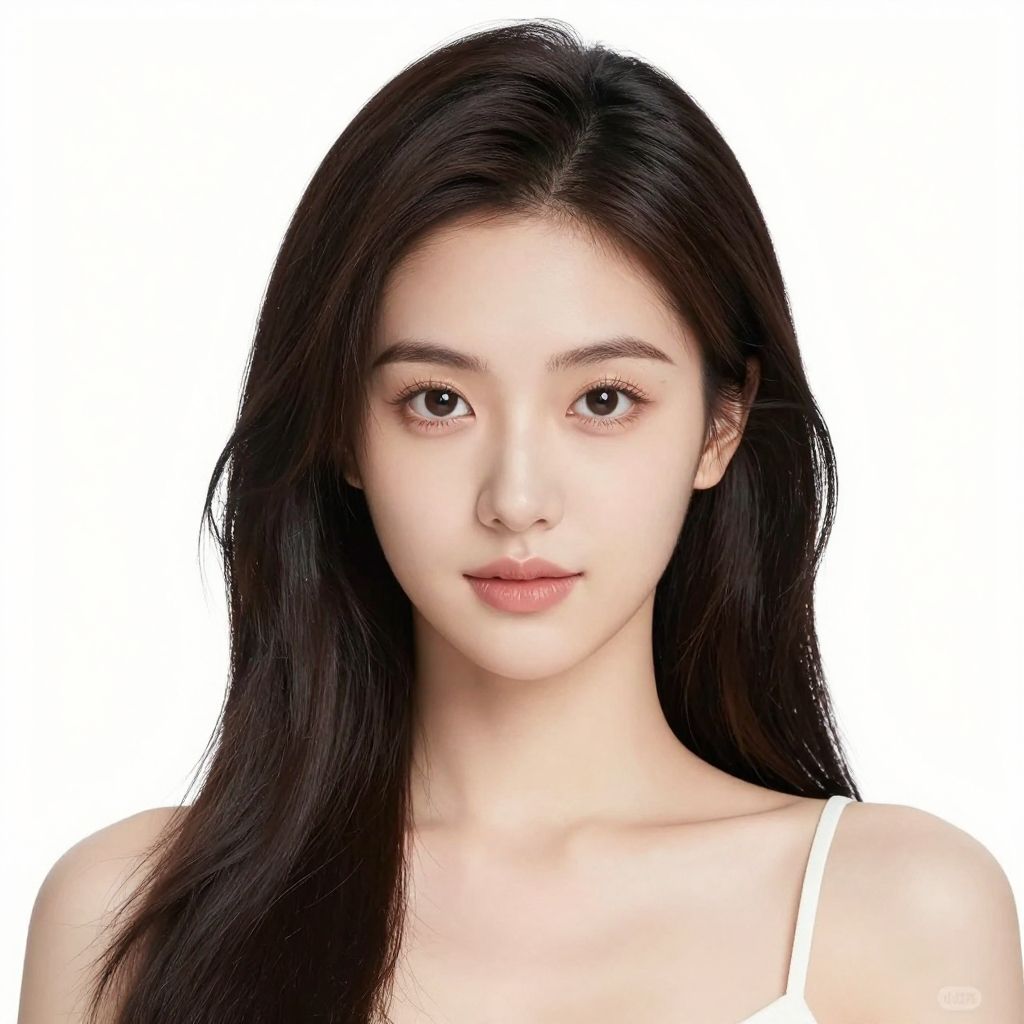 Digital portrait of a young Asian woman with fair skin, dark hair in a loose bun, wearing a white blouse and star earrings, against a soft blue