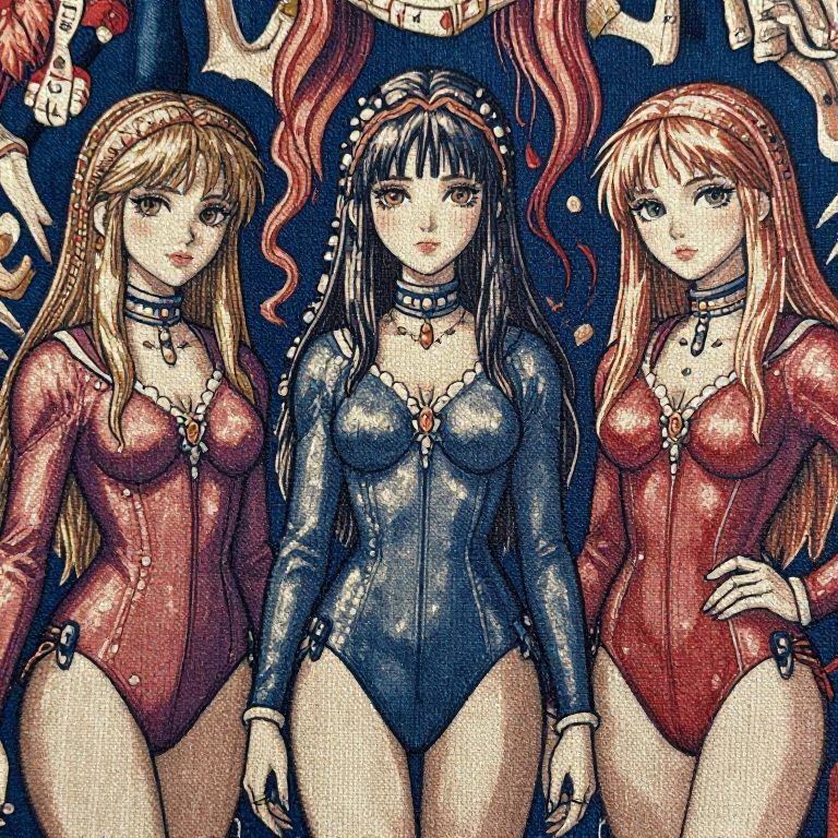 This digital artwork in a comic book style features three anime-style women with fair skin and long hair, standing side by side. They wear tight, high-cut, long-sleeve bodysuits in red, blue, and dark blue, respectively. Each bodysuit has a frilled, white collar and buttons down the front. The woman in the center has black hair with bangs, while the others have blonde hair. The background is dark blue with floating red ribbon-like strands. The women have large, expressive eyes and are posed confidently, with the central figure slightly forward. The art uses a limited color palette and a grainy texture, reminiscent of vintage comic book illustrations.