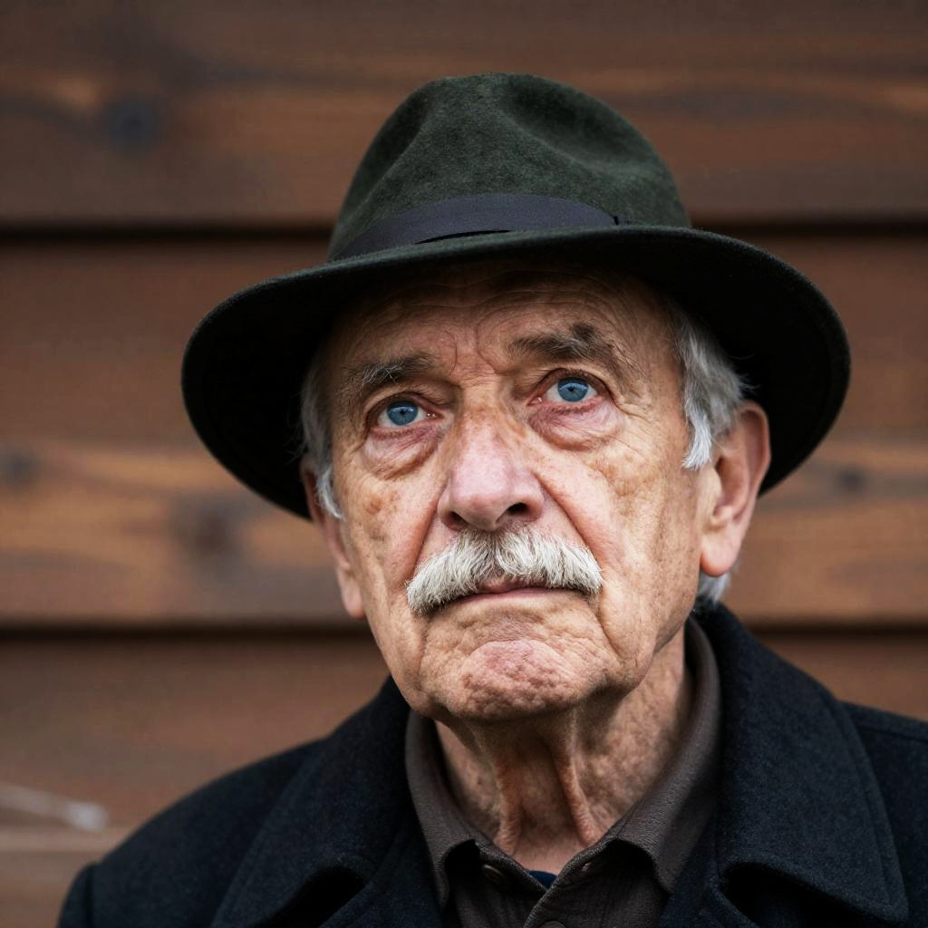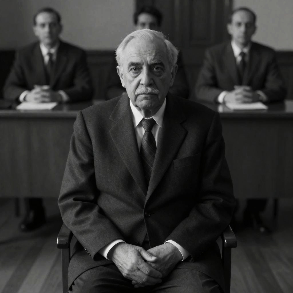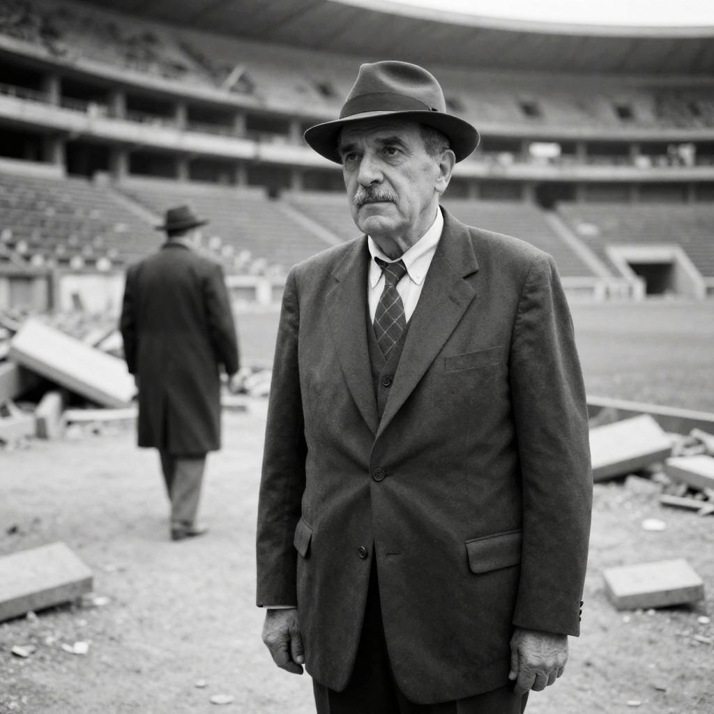 Black-and-white photograph of an older man with a mustache, wearing a fedora, suit, and tie, standing in a debris-filled, destroyed stadium. Background shows broken bleachers and another man in a long coat walking away.