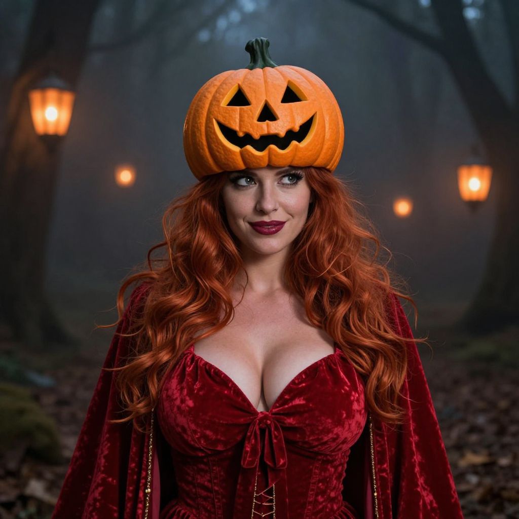 A woman with vibrant red hair wearing a detailed Halloween costume featuring a pumpkin mask and flowing red velvet robes, standing in a dark, foggy forest at night with glowing orange lanterns in the background, realistic photography style, dramatic lighting, expressive face with a knowing smile, detailed textures on the costume and hair. The woman has big breasts and cute face