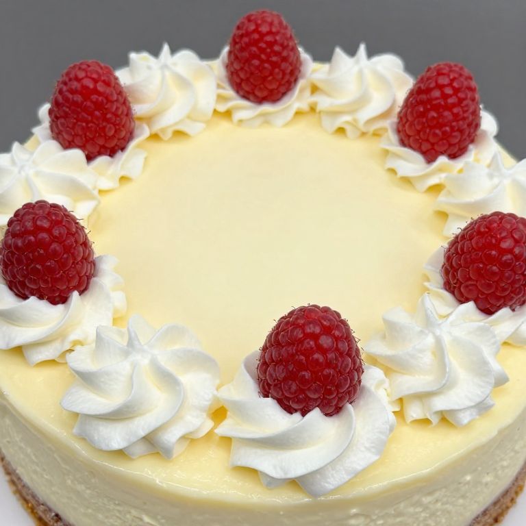 Delicate swirls of whipped cream encircle a smooth, pale yellow raw white chocolate cheesecake, adorned with six vibrant red raspberries artfully placed atop its creamy surface.