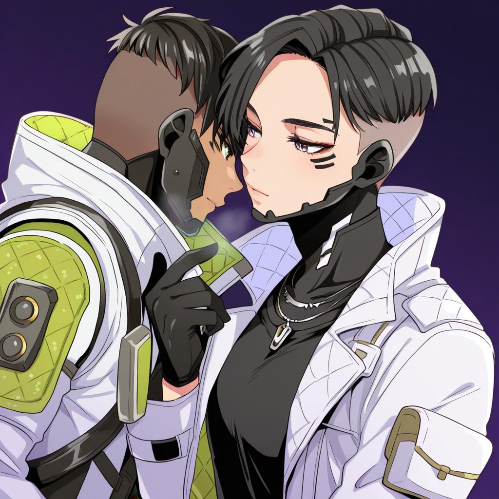 Crypto (apex legends), apex legends, 1boy, black eyes, black hair, parted hair, white jacket, black shirt, black gloves, necklace, undercut, by artist sukoyaka (100hituzi), illustrious