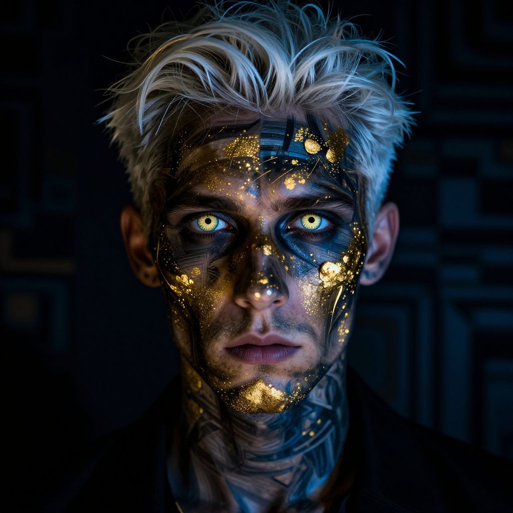 Photograph of a young man with short, spiky, platinum blonde hair and piercing blue eyes. His face is adorned with a dark, metallic mask-like pattern, illuminated with glowing golden spots, creating a striking contrast against his pale skin. The background is dark and indistinct, making the subject's illuminated face the focal point. His expression is intense and serious, with subtle shadows enhancing his facial features. The lighting emphasizes the metallic glow on his face, giving a futuristic, almost otherworldly appearance.