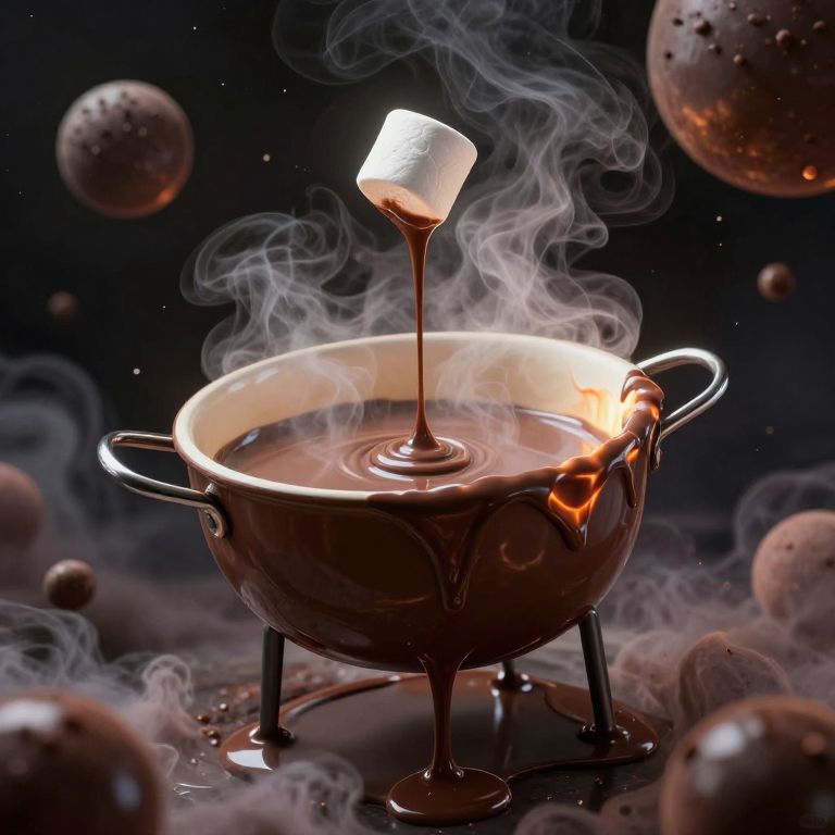 Enormous, singed fondue pot suspended in cosmic void, emitting billowing steam as rivers of molten chocolate cascade toward a tiny marshmallow moon, surrounded by floating spheres and nebulous clouds.