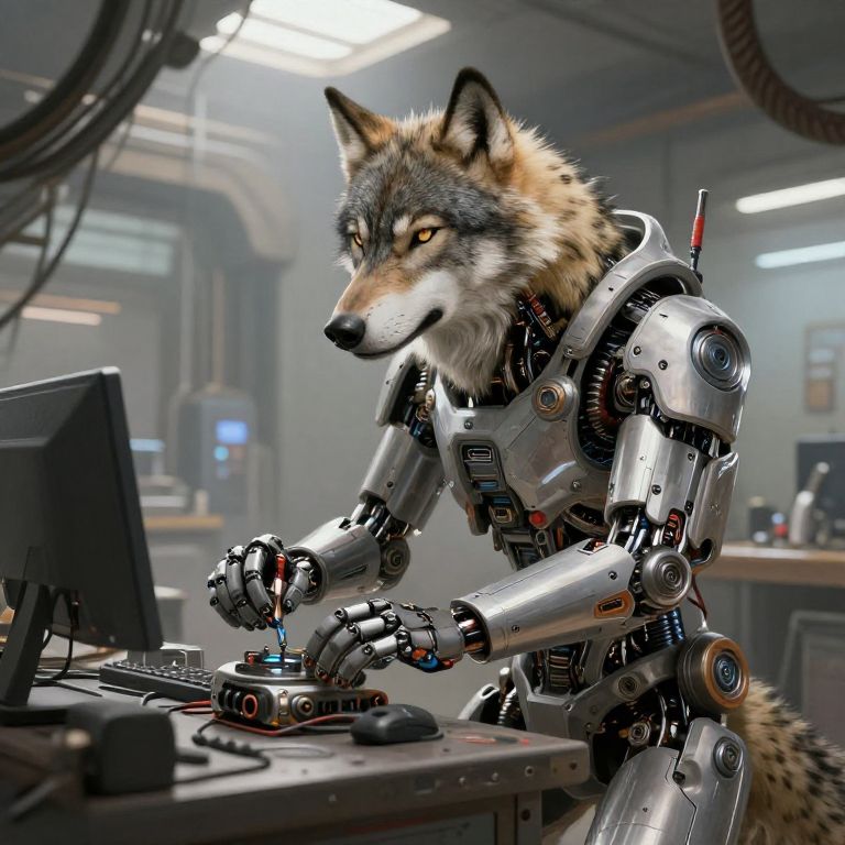 CGI image of a humanoid wolf robot with a realistic, fur-covered head and cybernetic silver arms and torso. The wolf's expression is focused as it types on a computer keyboard in a dimly lit, industrial workshop with visible cables and machinery in the background. The robot's fur is brown and gray with white accents, while its mechanical limbs are detailed with joints and circuits. The workshop has a metallic and gray color palette with a slightly blurry, industrial atmosphere. The wolf robot is centered and the computer is on the left side of the frame.
