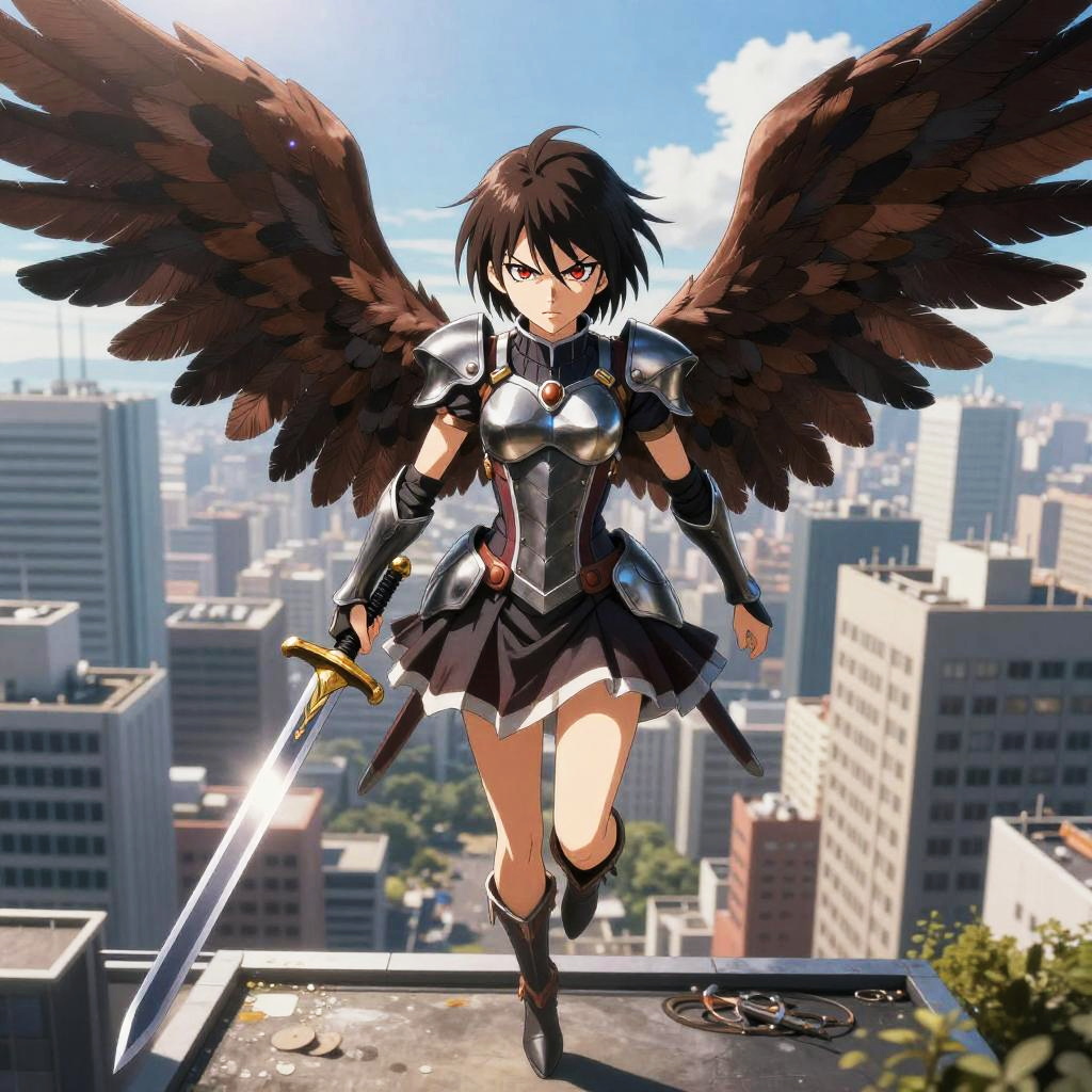 Score_9, score_8_up, score_7_up, source_anime, [tokyo ghoul], kirishima touka, [1girl], facing viewer, armored dress, dress, [angry], cowboy shot, [floating], holding sword, brown (feathered wings), highly detailed wings, upper back wings, large wings, [detailed eyes, [eyeshadow]], intricate background, skyscraper (rooftop), extremely detailed, volumetric lighting, 8k wallpaper, best quality, ultra-detailed, best illustration, detailed shadows, tracing, realistic, colorful, intense shadows, detailed face, 4k, highres, absurdres, [[light particles]], sunlight, 4k wallpaper, [[backlighting]], [lens flare], LORA