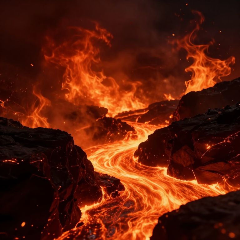 Inferno background with blazing fiery hues, intense molten lava rivers flowing through dark jagged rocks, glowing embers drifting in thick smoky air, cinematic dramatic lighting