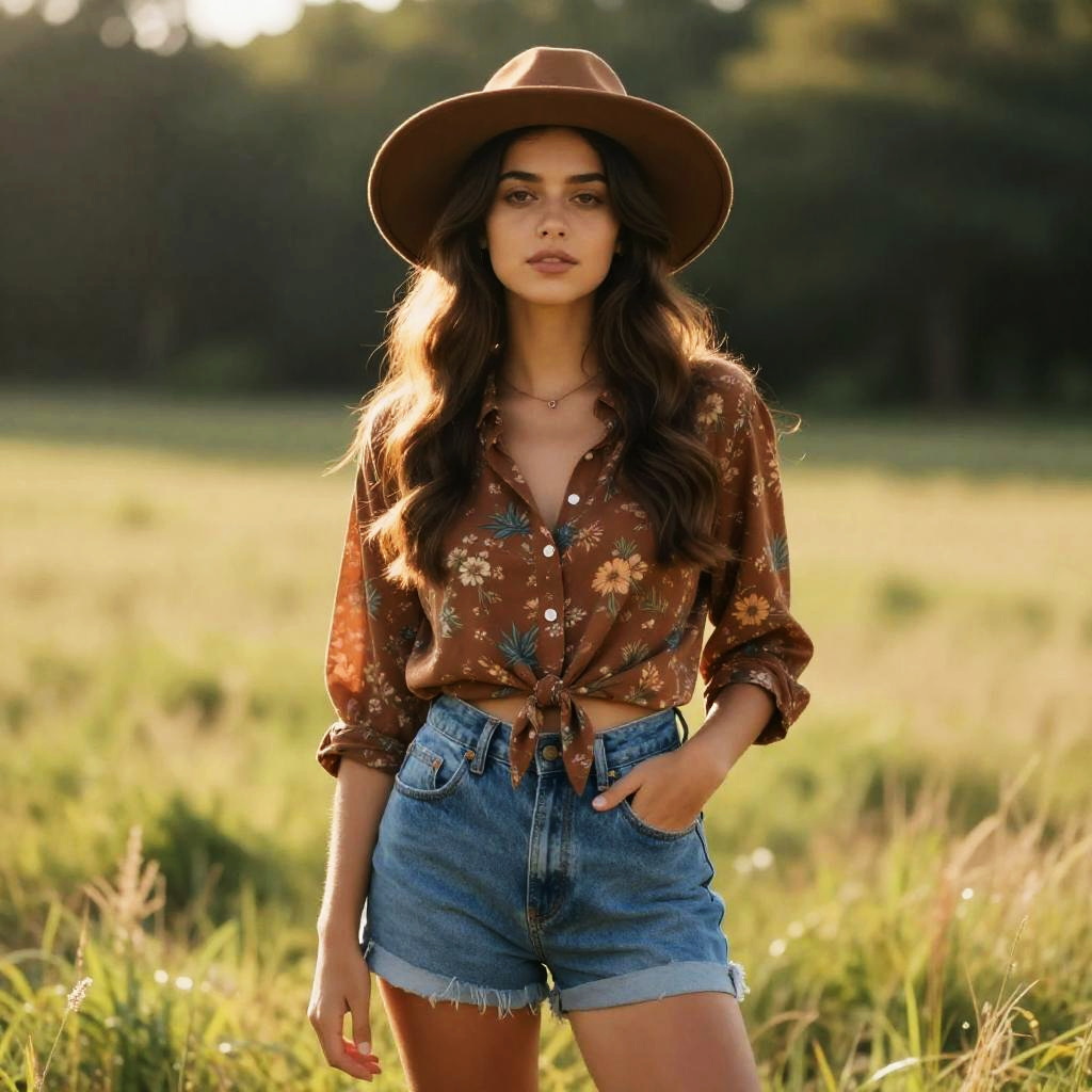 Young Woman in Denim Overalls and Straw Hat at Sunset