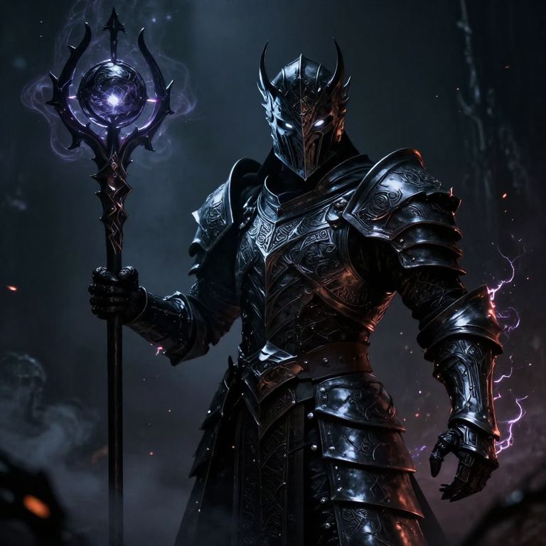 A graffitipunk digital shot of a silent, towering figure in an intricate twilight robe of indigo and silver, Their helmet radiates an eerie, cold light, illuminating their hollow, visorless gaze, In one hand, they wield a staff tipped with a fragment of broken starlight, humming with unseen energy, Ethereal chains spiral from their armor, shackling glowing symbols of lost souls, This Voidkeeper watches over the line between worlds, neither fully of life nor of death, Shadows coil around them like whispering spirits, merging into the dimming sky beyond, The background blurs into haunting twilight ruins, relics of worlds swallowed by the void
