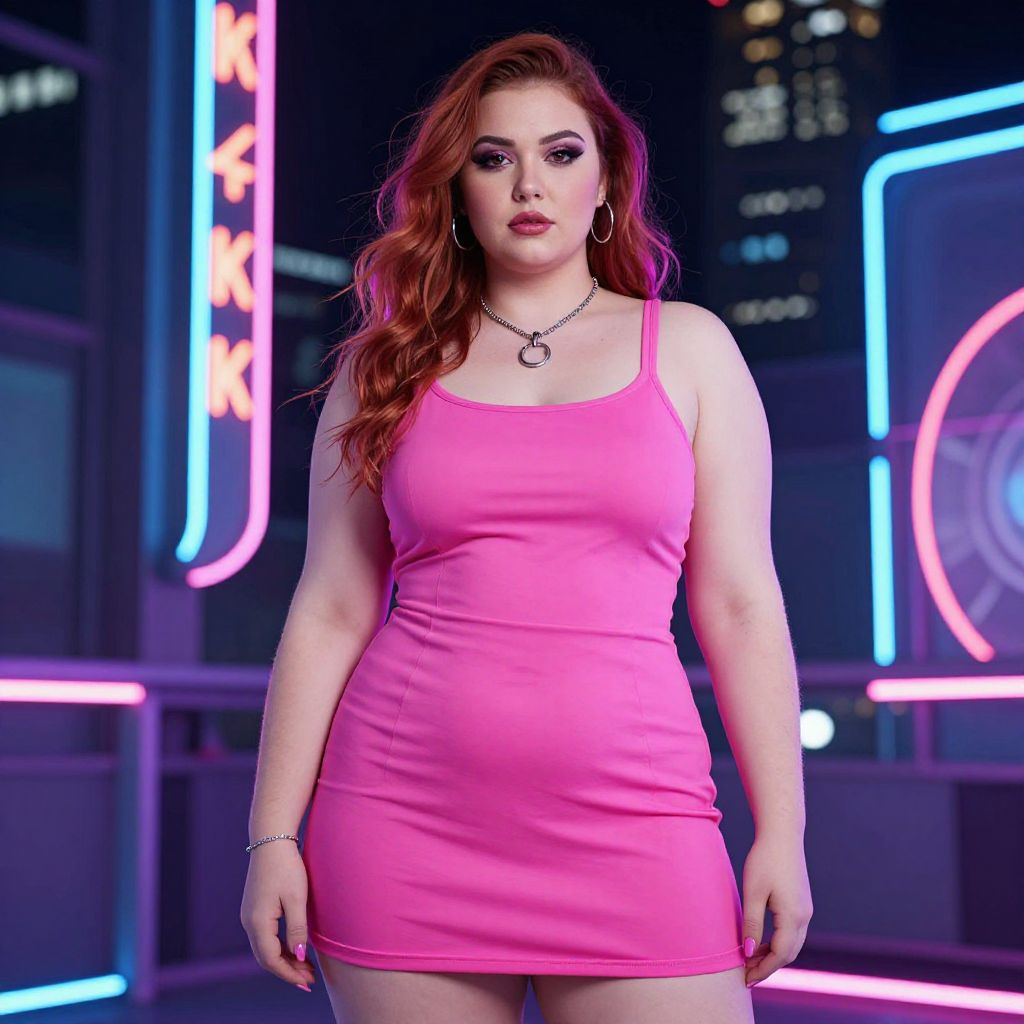 "Tense a beautiful young fat woman is posing in hot pink dress, in the style of post-internet aesthetics, goosepunk, cyberpunk, neon, leds, night, urban,"