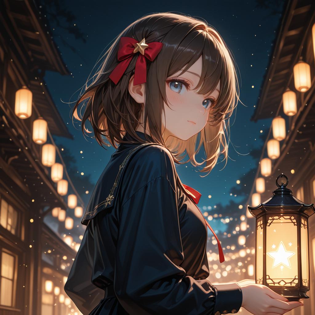 (extremely delicate and beautiful:1.2), 1girl, bangs, blue eyes, blurry, blurry background, bow, brown hair, closed mouth, from side, hair between eyes, hair bow, lantern, light particles, long sleeves, looking at viewer, medium hair, night, red bow, solo, star \(symbol\), upper body, smile, red lips