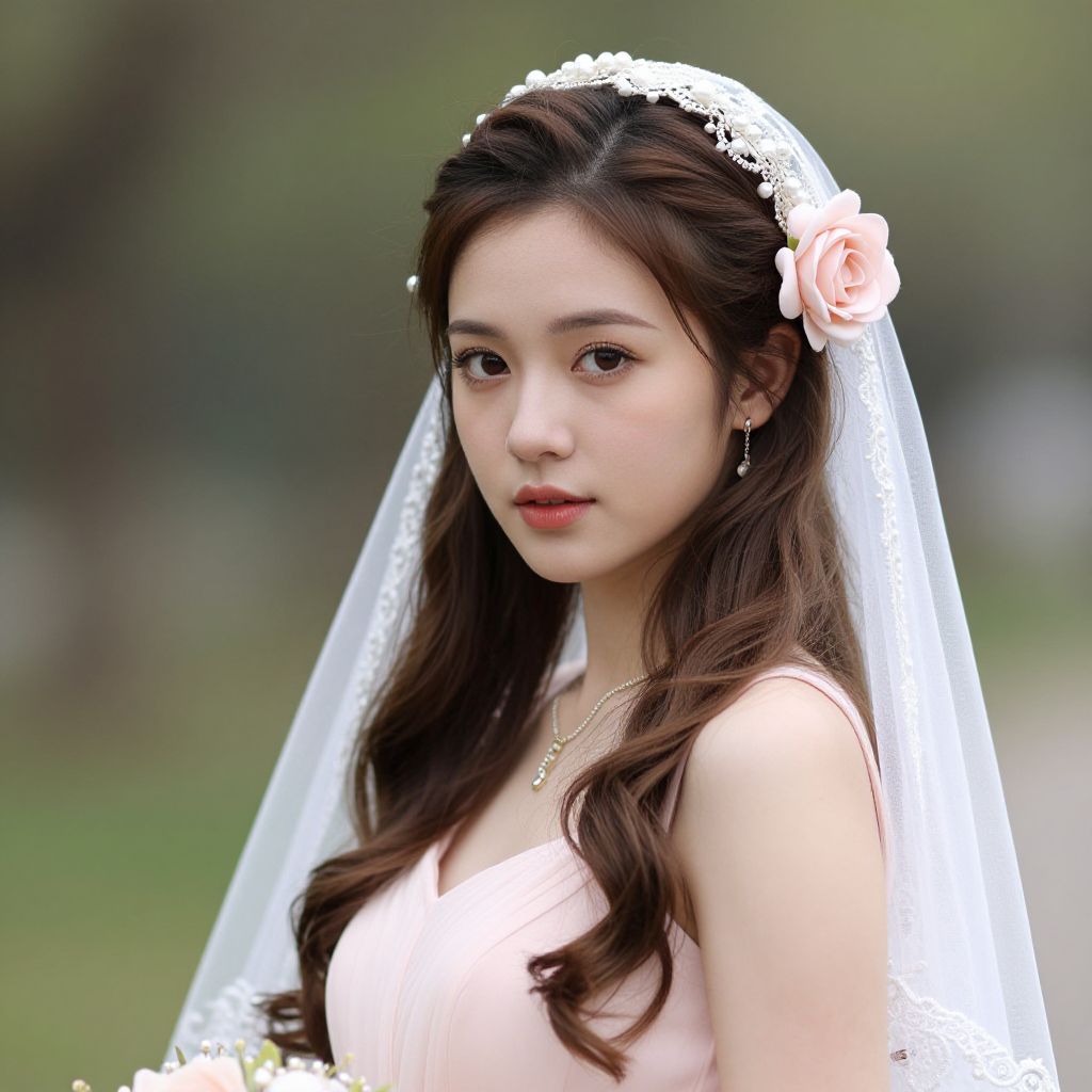 Photograph of an East Asian woman with long, wavy brown hair, wearing a delicate white lace veil adorned with a pink rose. She has fair skin, subtle makeup, and is dressed in a light pink, sleeveless wedding gown. She gazes slightly to the side with a calm expression. The background is softly blurred, featuring green and brown hues, suggesting an outdoor setting. She wears small, dangling earrings and a thin gold necklace. The image focuses on her upper body, capturing the soft texture of her hair and veil.