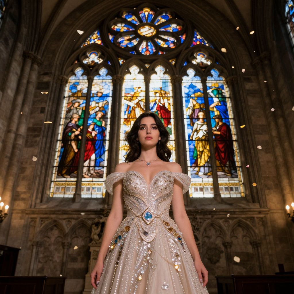 A woman in a detailed, sparkling dress stands in front of an intricately designed stained glass window in an old cathedral, surrounded by a flurry of petals and lights.