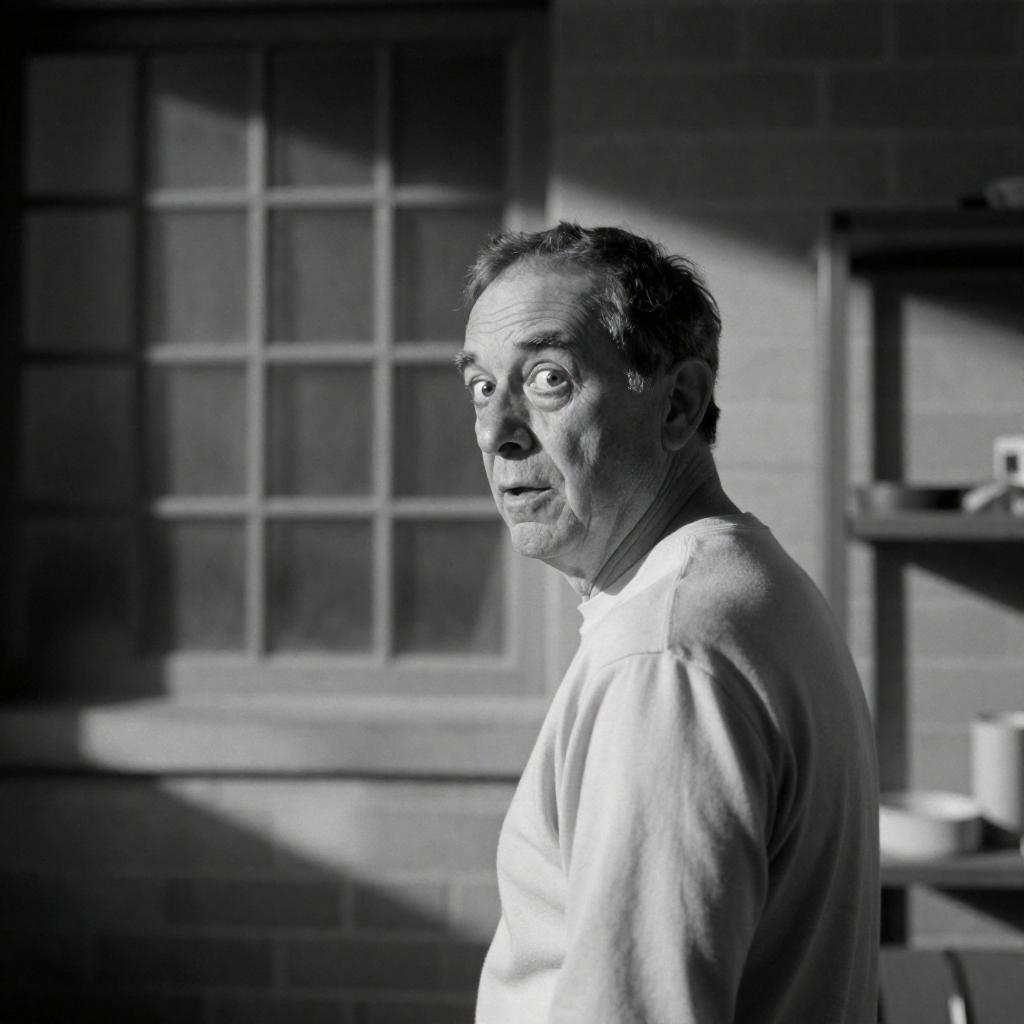 Black-and-white photograph of an older man with short, dark hair, looking over his shoulder with a surprised expression. He wears a light-colored shirt and is standing in front of a brick wall with a large, grid-patterned window. Shadows cast on his face and the wall. Metal shelving is on the right.