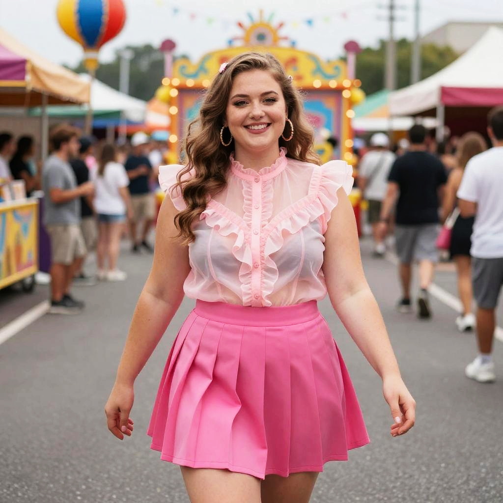 Fat redneck girl at a country fair, holding a large homemade pie, wearing a bandana and a faded t-shirt with rolled-up sleeves, colorful fair tents and balloons in the background, lively and fun scene with bright, cheerful lighting and rustic charm.