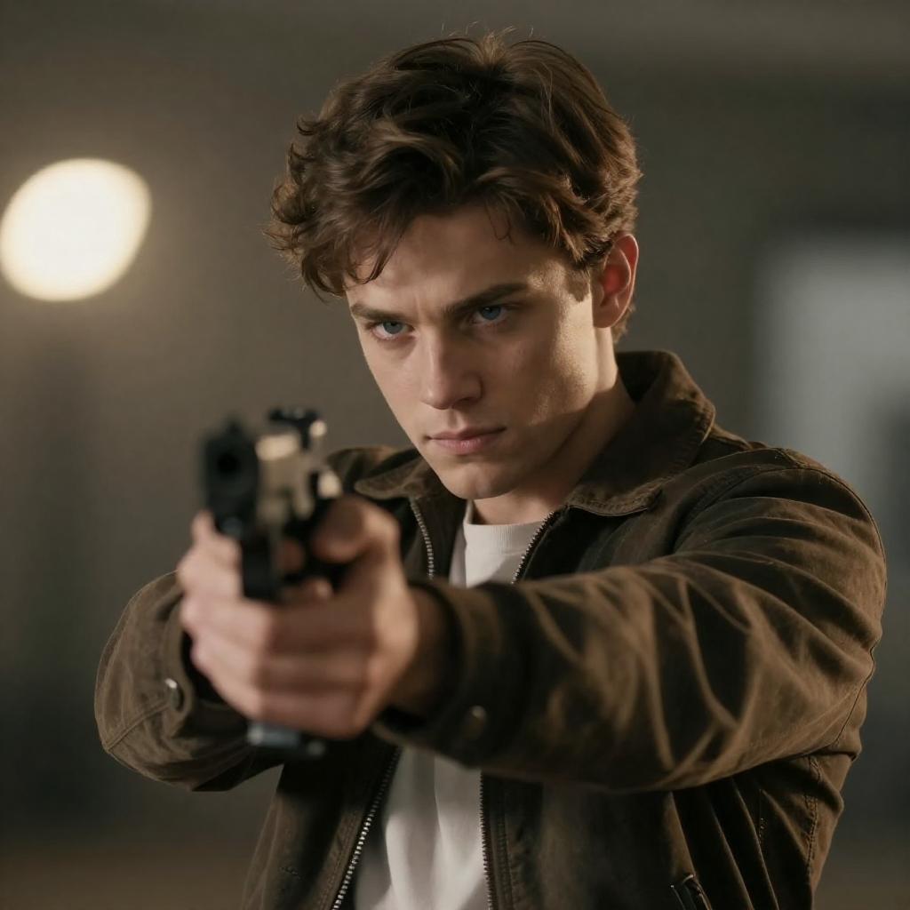 Photograph of a young man with medium-length brown hair, wearing a dark jacket with a white stripe, pointing a handgun directly at the camera. He is kneeling in a dry, grassy field with a rocky hill in the background. His expression is intense and focused. The gun is centered in the foreground, emphasizing the threat.