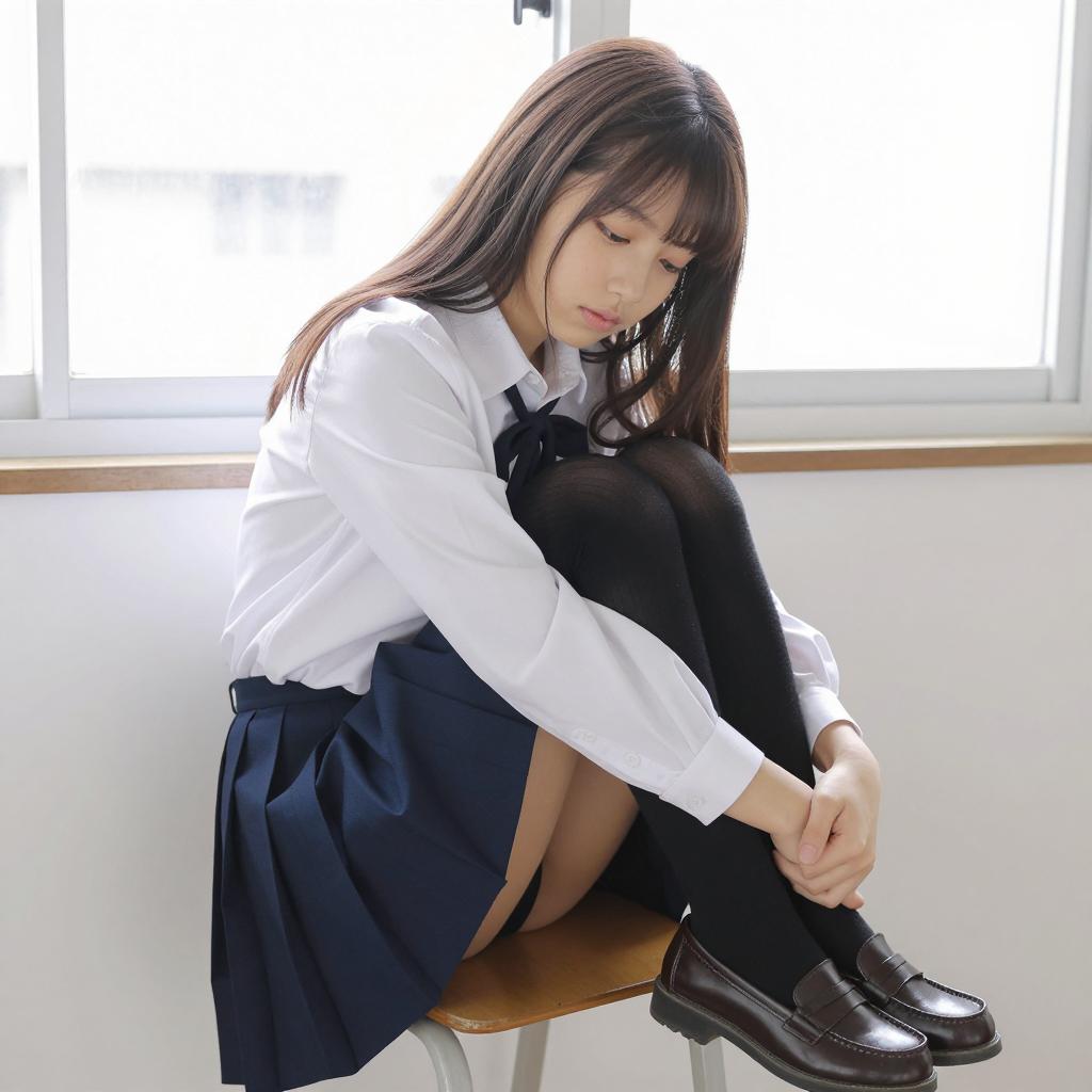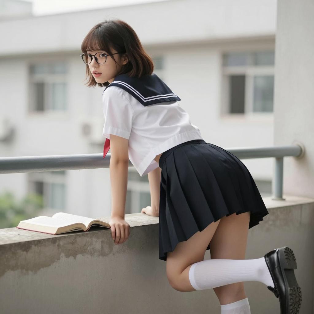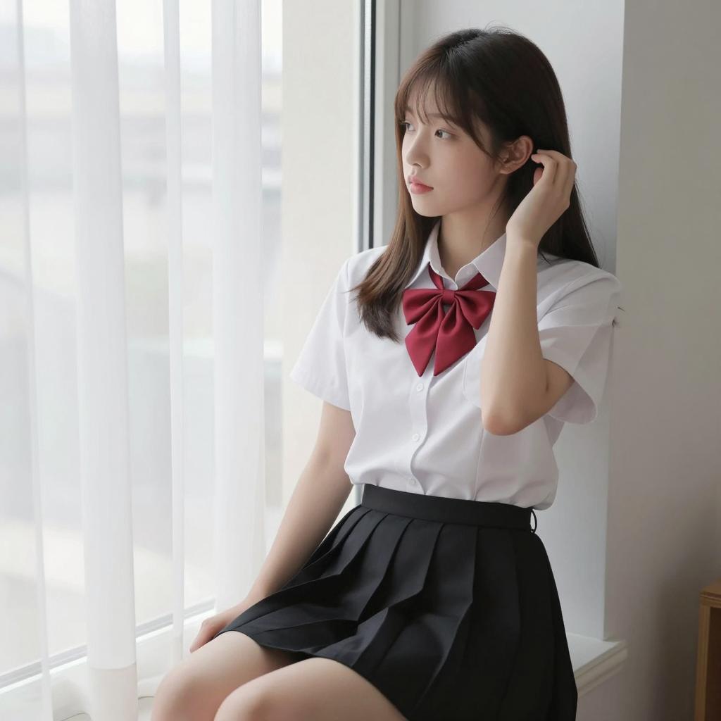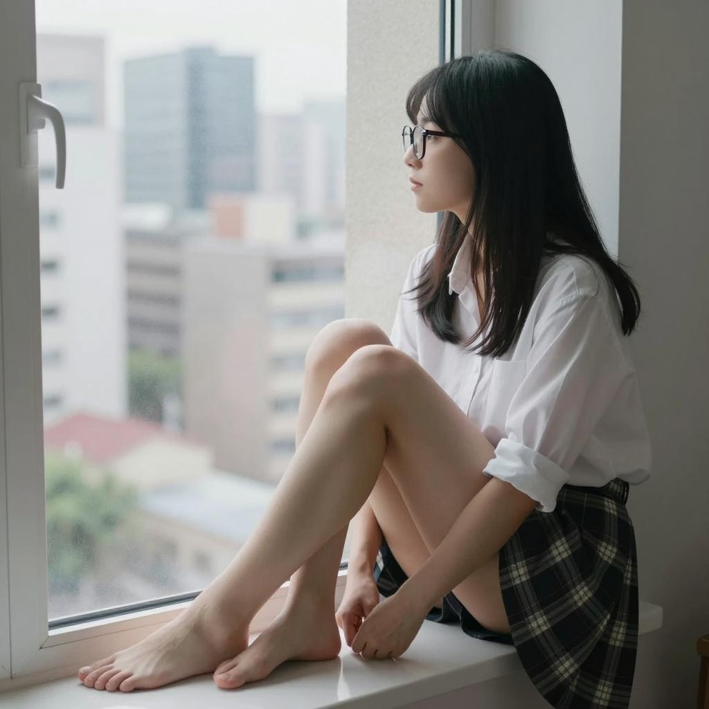 Asian woman with long black hair, glasses, white shirt, and plaid skirt sitting on window sill, legs bent, feet bare, looking out window, urban cityscape blurred in background. "CKSxJAPAN" on left. Soft natural light.