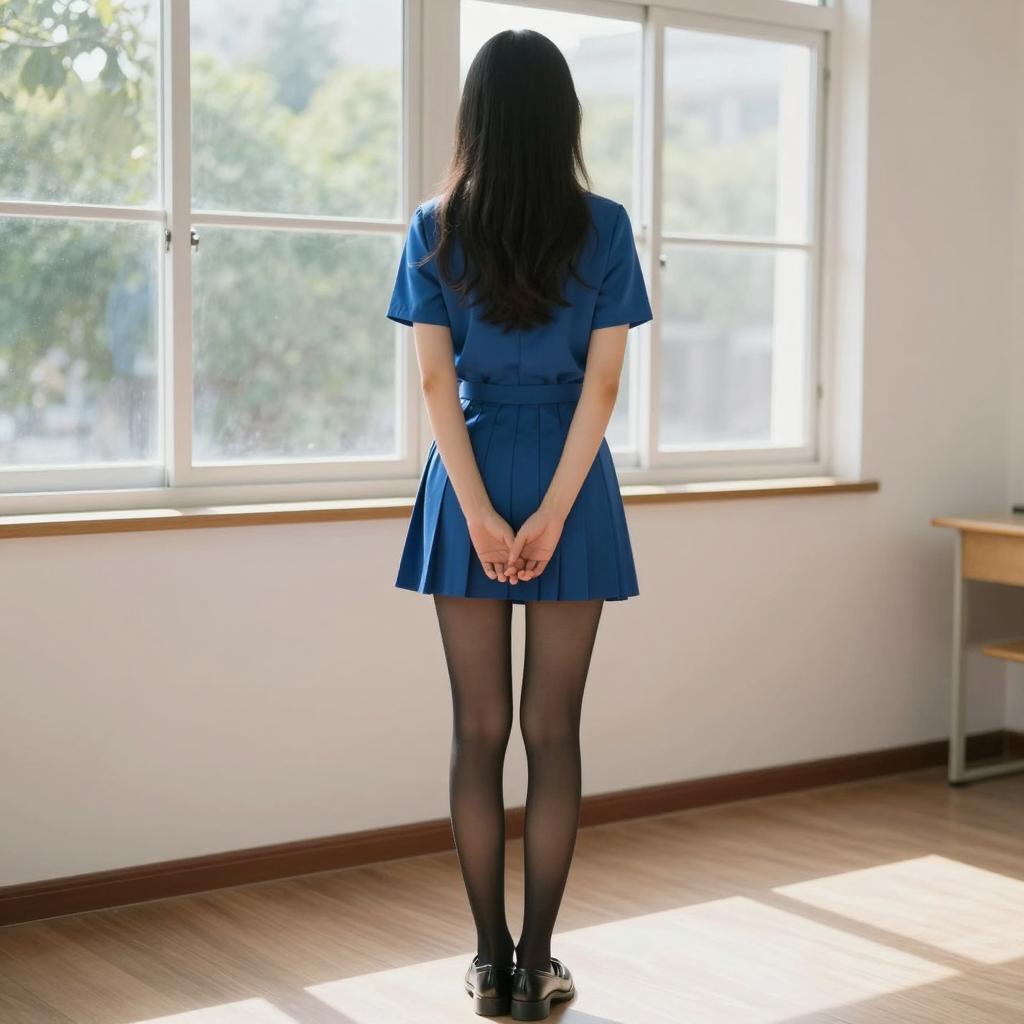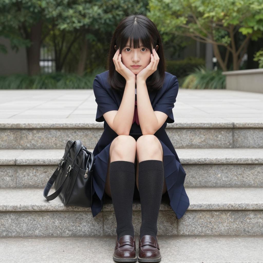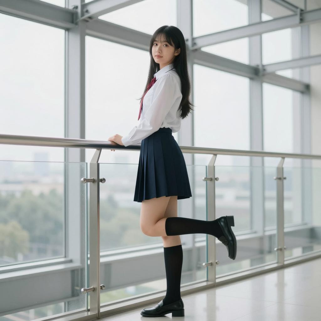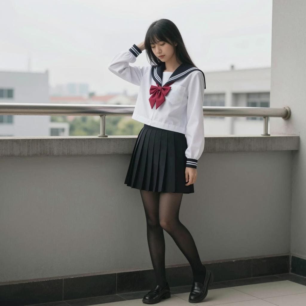 Asian Woman on Window Sill in City