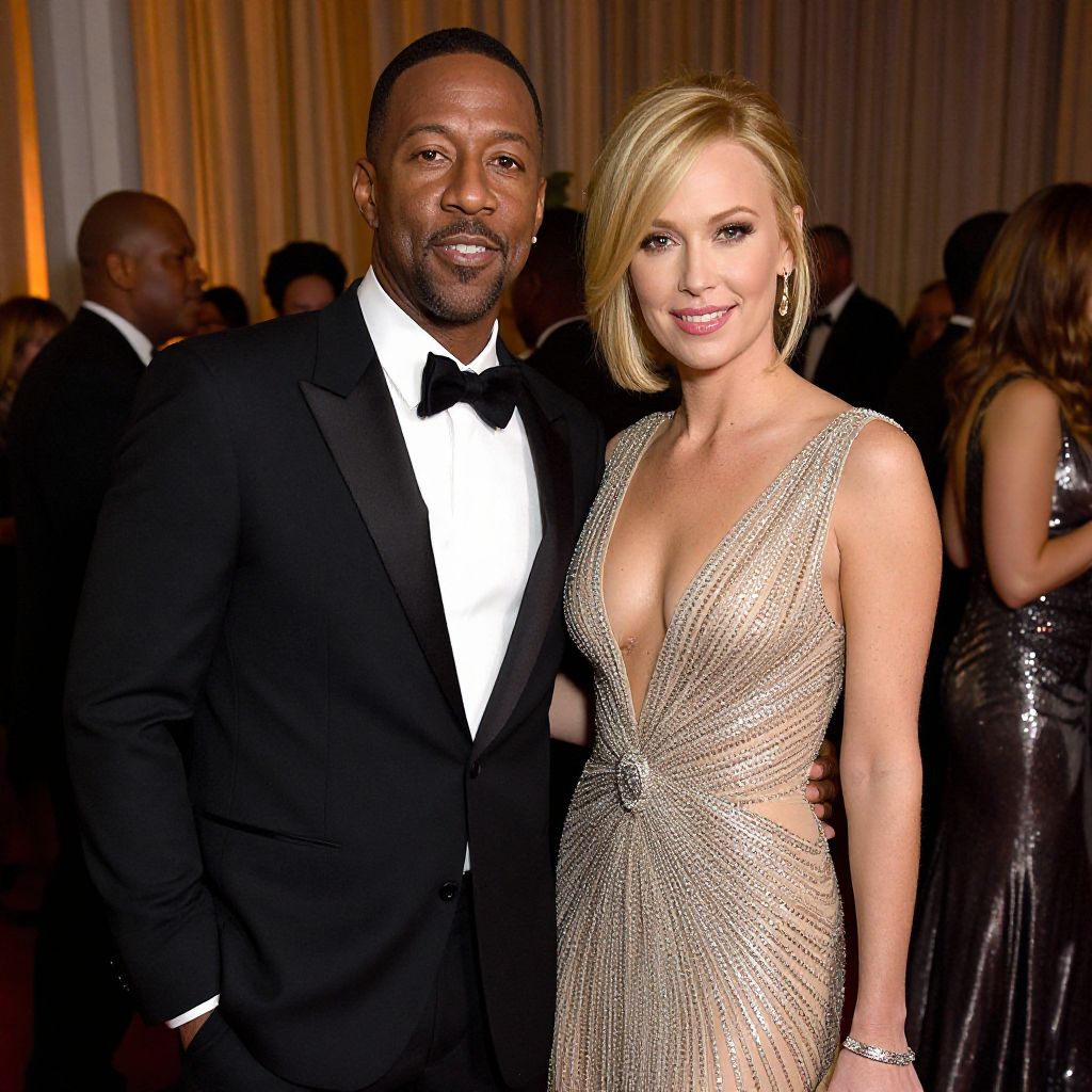 Usher and a blonde woman pose together at a formal event, both dressed elegantly with Usher in a black suit and the woman in a sparkling, embellished dress.