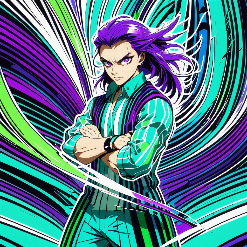 A vibrant anime-style digital illustration featuring a confident character in a power stance with crossed arms with detailed clothing, bold clean lines and high contrast shading, vivid color palette with dominant purples, blues, and greens. The background resembles a stylized comic book panel with sharp white and purple stripes creating energy and movement. The character has expressive, sharp eyes, detailed hair, and fashion accessories. The piece showcases contemporary anime aesthetics with excellent depth and lighting.