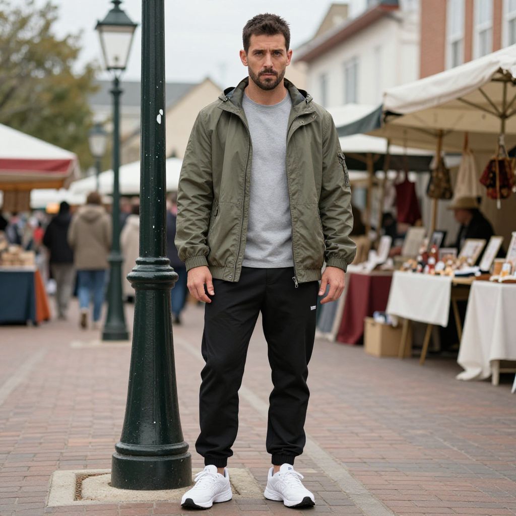A man, rugged olive green windbreaker, black moisture-wicking track pants, white athletic sneakers, layered grey t-shirt, charming market square, colonial-style lamp posts, bustling artisan stalls, eastman film stock, focused expression, vibrant atmosphere. Man has masculine face and piercing eyes