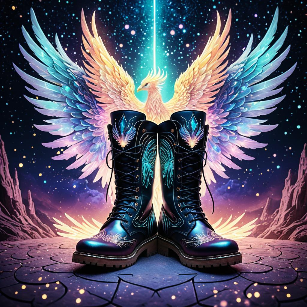 Illustration featuring a pair of intricately detailed boots with phoenix feather designs, glowing with magical illumination. The boots are set against a celestial twilight background with ethereal phoenix wings spreading wide, surrounded by a starry, iridescent pastel glow. The scene captures a fantastical elegance and whimsical ambiance in ultra-detailed 4K resolution.