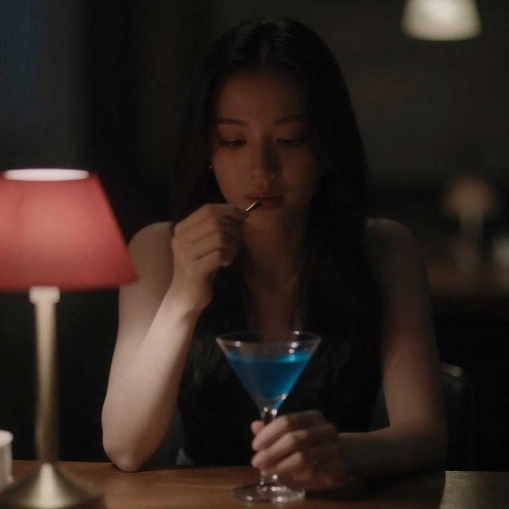 A dimly lit photograph of a young woman with long, dark hair, sitting at a table. She holds a small object in her right hand and a blue cocktail glass in her left. A red lamp is blurred in the foreground. The background is dark and indistinct.