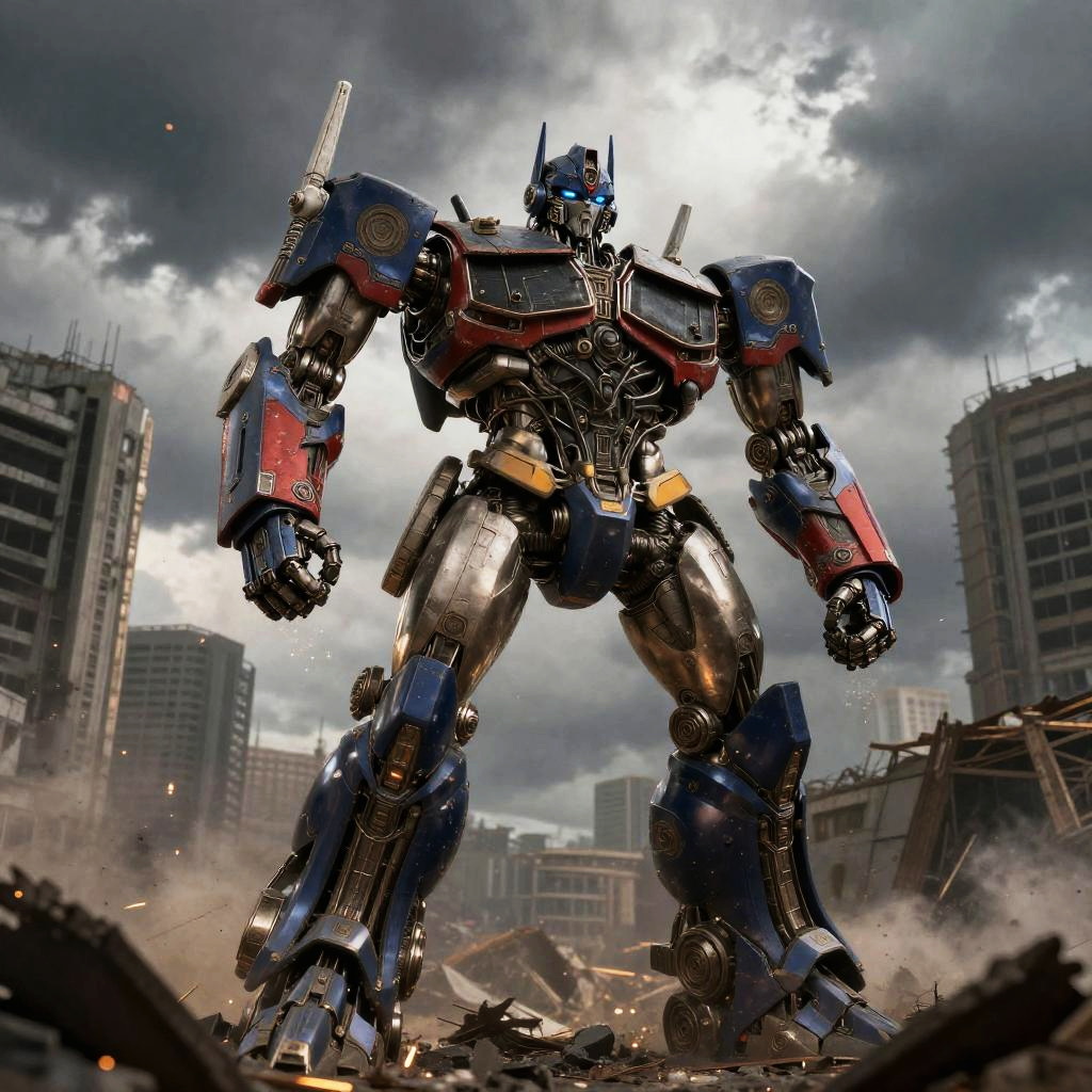 Defiant stance of a towering robot in a ruined urban landscape, fists raised, sparks flying, gritty sci-fi aesthetic, dark clouds overhead, detailed mechanical design, powerful mood
