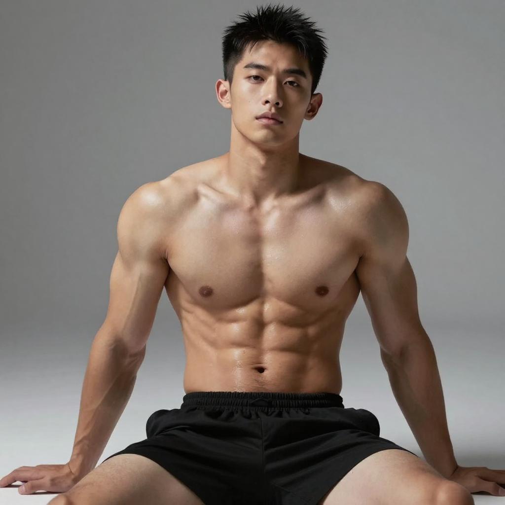 Photograph of a muscular, young Asian man with spiky black hair, sitting on the ground. He's shirtless, showcasing a well-defined, sculpted chest and abs, and wearing black shorts. His skin is smooth and glistening under the soft, studio lighting. The background is a gradient of gray to white, highlighting his physique. His expression is serious and focused.