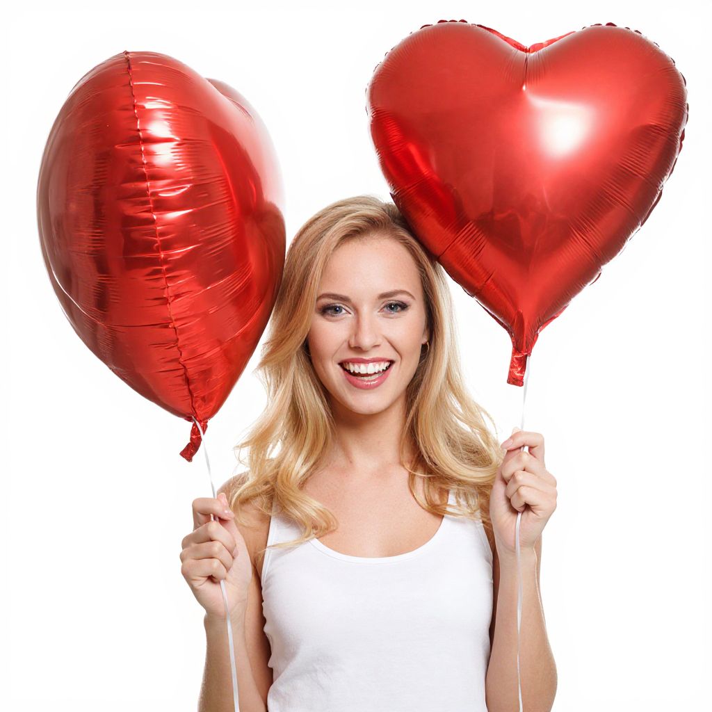 Blonde woman smiling brightly while holding a large red heart-shaped balloon against a pure white background.