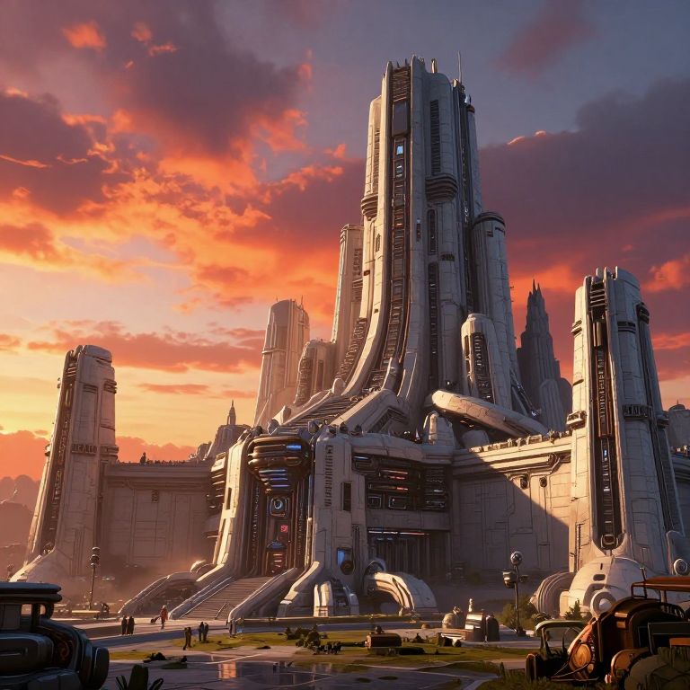 Photorealistic CGI of a futuristic, towering sci-fi cityscape at sunset, with vibrant orange and purple skies, and small robotic figures in the foreground