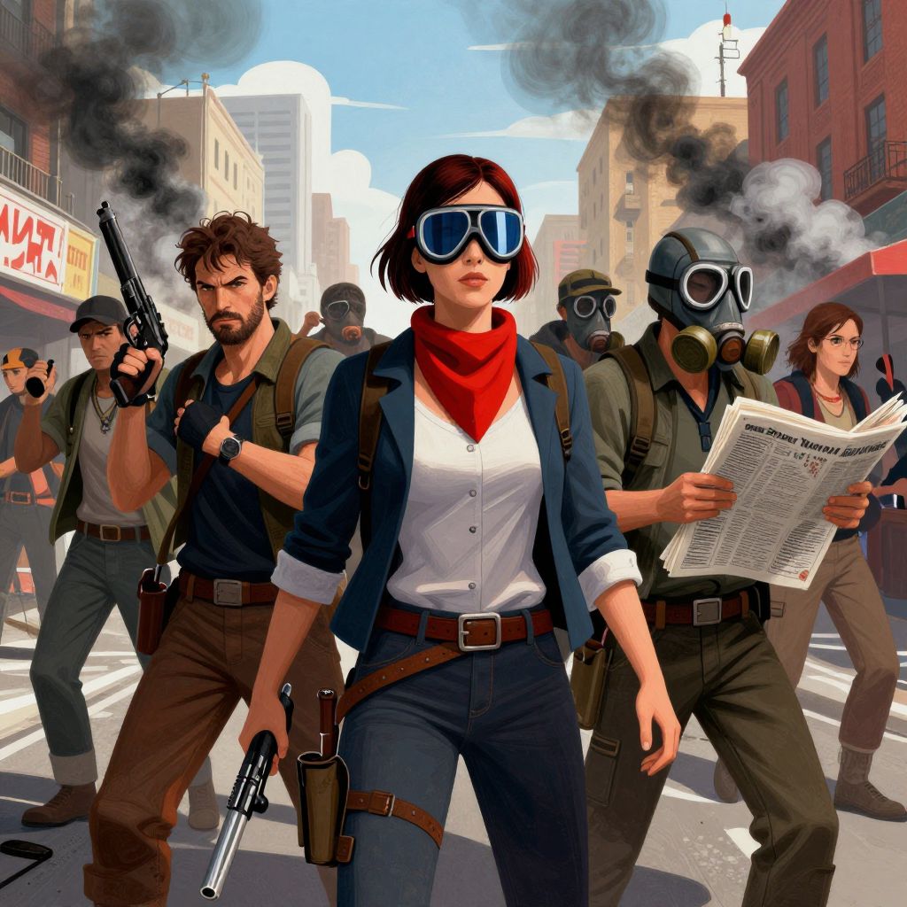 Digital illustration of an action scene in a city street with smoke in the background. At the center, a confident woman with short brown hair, wearing blue sunglasses, a white blouse, blue jacket, red scarf, and blue jeans, holds a gun in her right hand and a newspaper in her left. Surrounding her are five male characters, all in brown outfits with belts and holstered guns, one with a gas mask. The man closest to her has a beard and wavy hair. The background features red-brick buildings and a bright blue sky. The style is vibrant and comic-like.