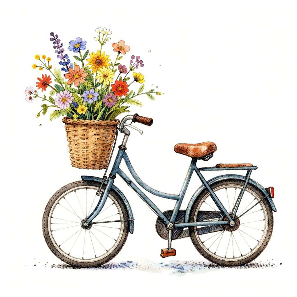 A whimsical illustration of a miniature bicycle with blooming flowers entwined around the frame, hand-drawn cartoon style; dynamic, expressive linework with varied thickness; soft watercolor washes over detailed ink outlines, textured brushstrokes; fine cross-hatching and stippling techniques; isolated on a white background.