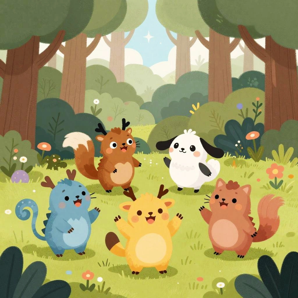 Create children's book illustrations online free, featuring whimsical characters and vibrant scenes with playful animals and magical forests, in a colorful storybook style, perfect for young audiences, with soft pastel colors and joyful expressions.