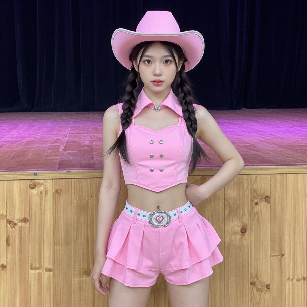 Photograph of an Asian woman with long black hair in braids, wearing a pink cowboy hat, sleeveless pink crop top with double buttons, and pink ruffled shorts with a blue and white studded belt. She stands in front of a wooden stage with a black curtain background, illuminated by pink stage lighting. Her expression is neutral, and she has light skin. The image has a slightly surreal, digitally-enhanced quality, emphasizing bright colors and sharp contrasts.