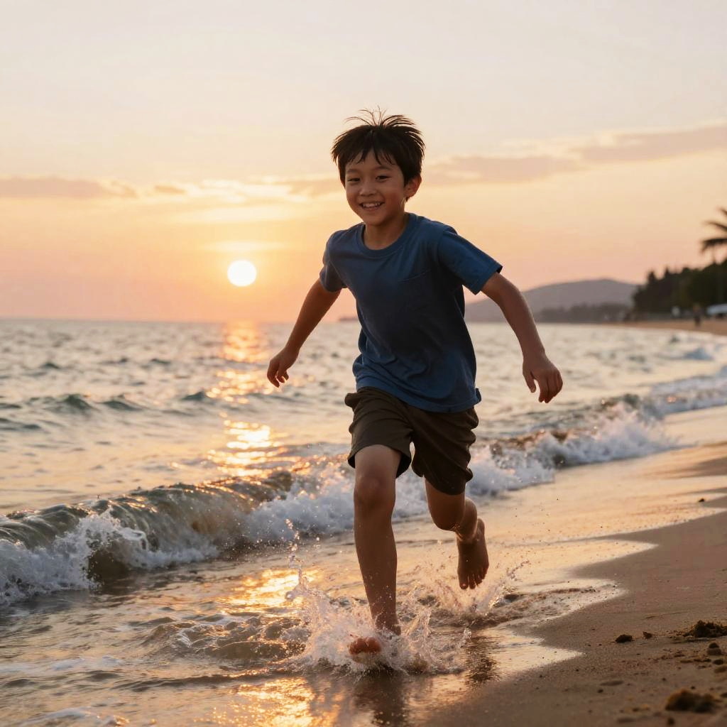 Joyful Boy Running on Sunset Beach