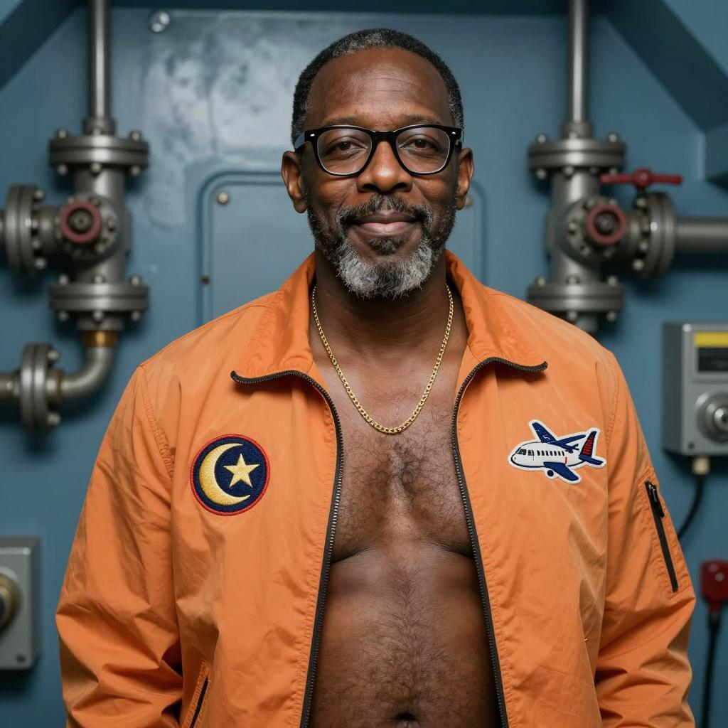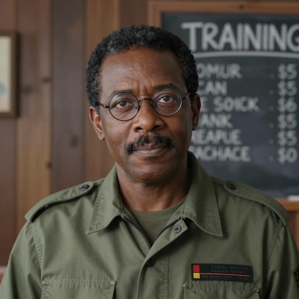 A middle-aged Black man with short curly hair, wearing round glasses and a green military-style shirt. He has a mustache and is looking slightly to the left. Background includes a dark wooden wall and a chalkboard with "TRAINING" and menu items. He is centered in the frame.