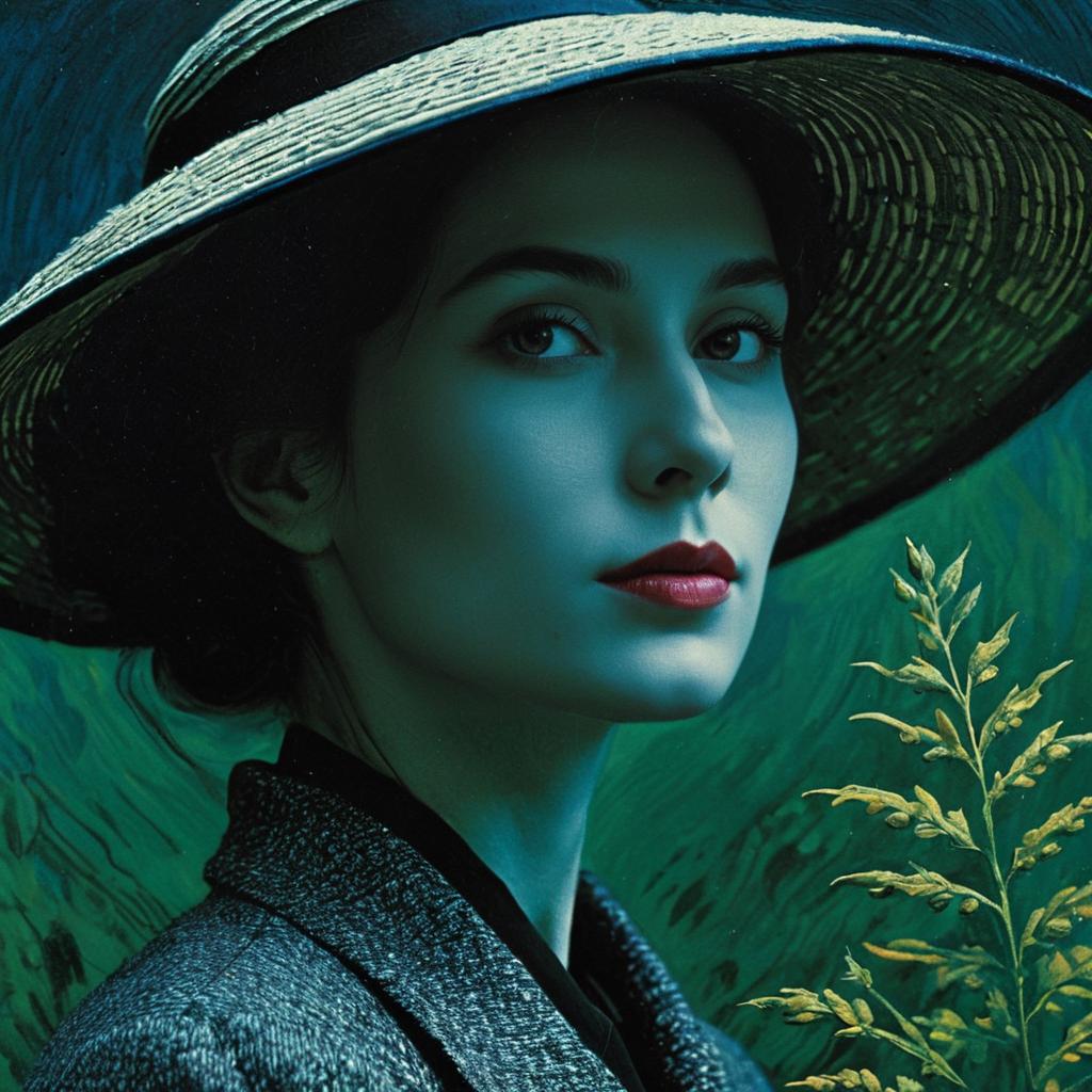 Extreme close-up abstract portrait of a young woman with light skin and dark hair, wearing a large woven hat and a textured coat. The image features impressionist and abstract elements inspired by artists such as Claude Monet and Edward Hopper, with night tones and nature motifs incorporated in the background, including stylized yellow-green foliage.